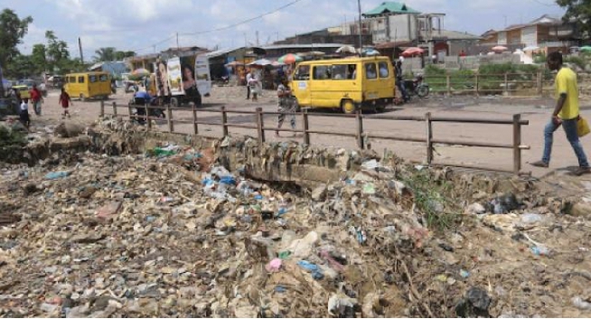 De passage au pont Bongolo, on peut observer des couches de bouteilles, de sacs en plastiques usagers et boites de conserve. Du plastique qui stagne au bord du pont empêche l’écoulement normal des eaux usées.